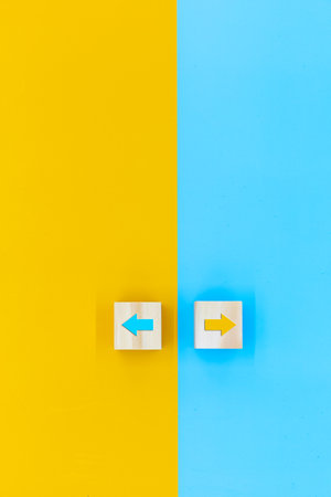 Conceptual image of choice and direction. Wooden blocks with arrows pointing in opposite directions. Beautiful wooden table, white background, copy space.