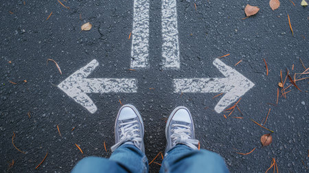 man legs in sneakers standing on road with three direction arrow choices, left, right or move forward --ar 16:9 --v 6 Job ID: e5001163-ac46-4bf7-b28c-75abfae32cee
