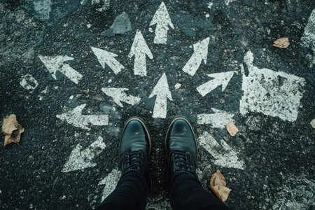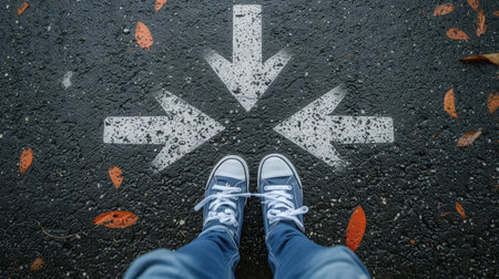 Arrows pointing in different directions, a person standing on the ground wearing shoes, looking down at the arrows pointing towards them. --ar 3:2 --stylize 750 --v 6.1 Job ID: b25a5bde-e90f-4ede-9cc4-eebd77ff79d2