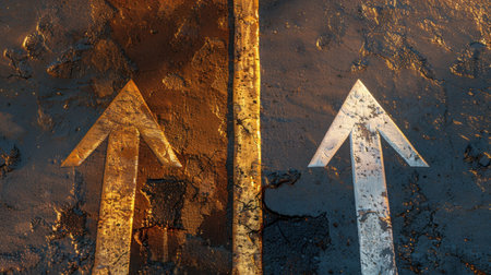 Image features close up view of road surface with two arrows pointing upwards, indicating direction. texture of asphalt is visible, showcasing mix of colors and patterns, creating interesting