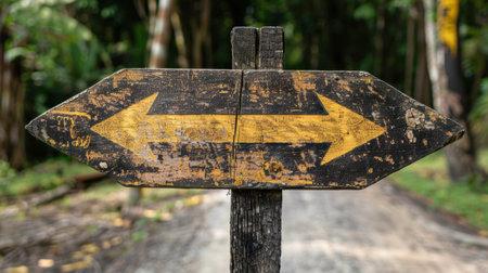 Old wooden signpost with yellow arrows indicating directions in lush green forest. weathered texture adds character, while vibrant colors contrast with natural surroundings