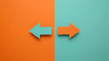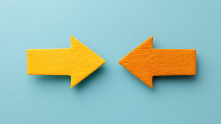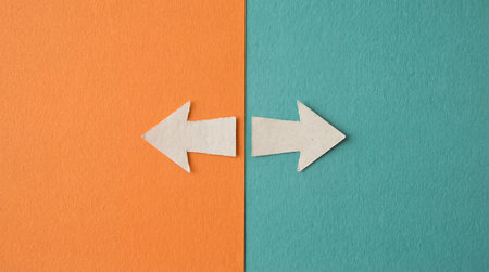 Two arrows pointing in opposite directions on divided color background. Concept of different opinions, choices, or decision making.