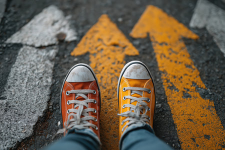 A close-up view of colorful sneakers standing on a street marked with directional arrows. This image captures the youthful spirit and individuality often associated with gen z culture. ai generated.