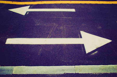 Vintage looking Direction sign with white arrows over asphalt