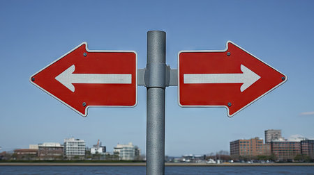 A traffic sign with two arrows pointing in different directions, indicating the choice between left or right for one direction and upward to another road, set against an urban background of buildings near water. The focus is on the red triangle shape of the arrow signs and their gray frames, contrasting beautifully with the blue sky above. In front of them stands a pole that emerges from behind a blurred cityscape, adding depth to the scene. The image was shot during daylight with natural light, using a Canon EF-S lens. --chaos 30 --ar 16:9 --v 6.1 Job ID: 169d518b-9a27-4126-8b9e-9a100e7ef6f7