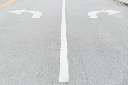 White arrow signs painted on road as direction restriction. Arrow signs as road markings on a street with two lanes