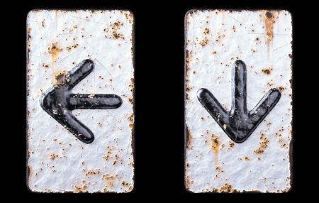 Set of symbols left arrow and arrow to down made of forged metal on the background fragment of a metal surface with cracked rust. 3d rendering