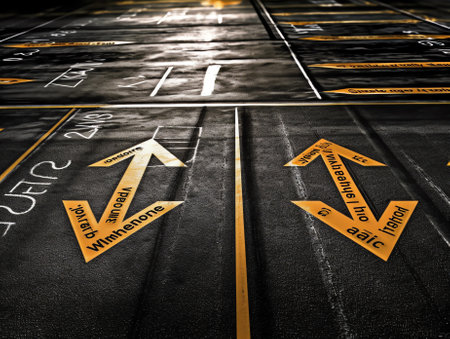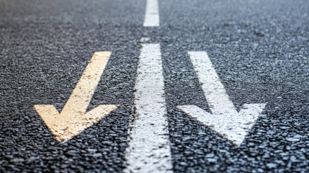 A close-up view of a road surface featuring vibrant yellow arrows that guide traffic direction. This image captures the essence of urban infrastructure and safety.