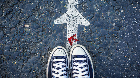 Youth street lifestyle. Male sneakers on asphalt road with drawn direction arrow as millennial education guidance, student guide, consultation and advisory, top view.