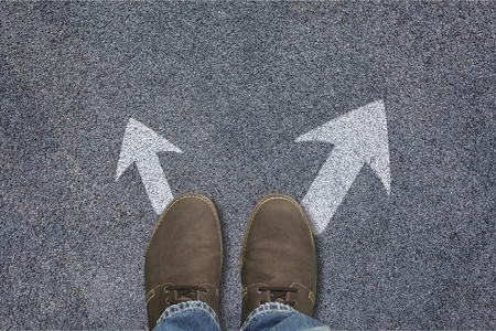 Decision Point: Feet Between Two Arrows Marking Uncertain Future Directions