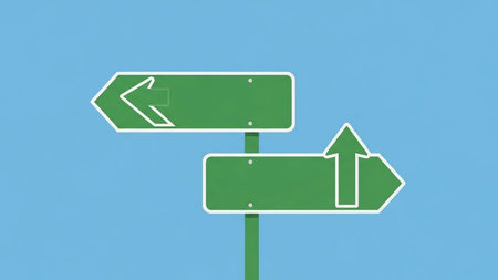 Two green rectangular road signs with white left and forward arrows set against a solid bright blue sky background in a flat style