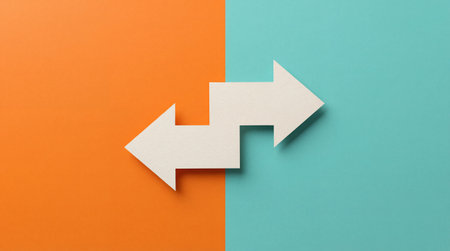 Two arrows, one white pointing left and one orange pointing right, set against a textured turquoise background.