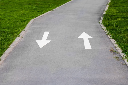 What direction should I take. White arrows left and right on asphalt.