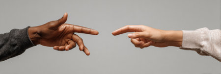 Two hands, one with dark skin and one with light skin, reach toward each other. The index fingers of each hand nearly touch, suggesting unity.