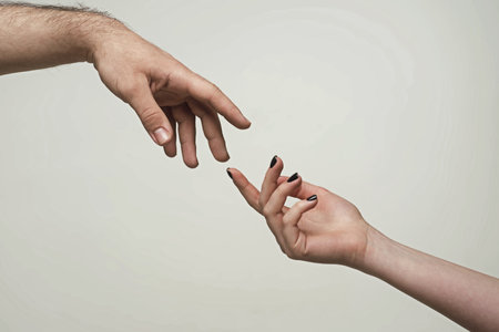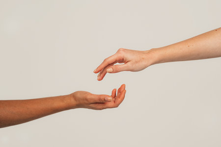 Two hands reaching toward each other on light gray background, closeup
