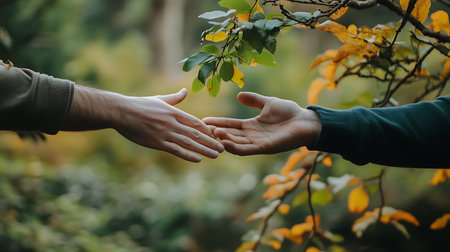 Close-up of two hands reaching for each other in the autumn forest