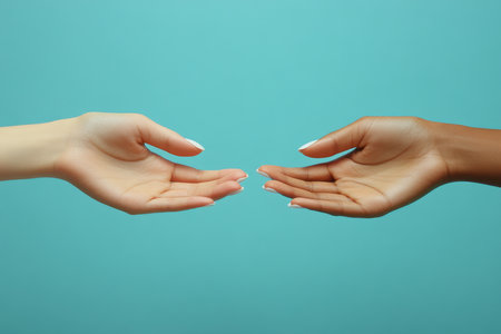 Two hands reaching out towards each other isolated on blue background.