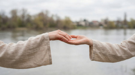 A close-up shot of two hands tenderly connecting over a blurred natural background of a tranquil lake and trees on a cloudy day, symbolizing unity, care, and intimacy.