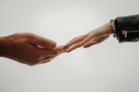 A gentle touch of the hands of a man and a woman on a white background. Love connection help concepts. Be hand in hand. Touching each other.