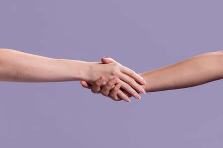 White and black hands of unrecognizable people clasped together on violet background, close up. International relationship, connection, togetherness, contrast, unity concept.