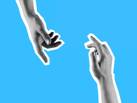 A moment of connection captured with two hands almost touching, set against a clear blue sky background.