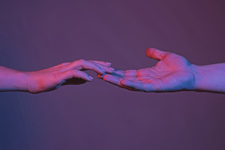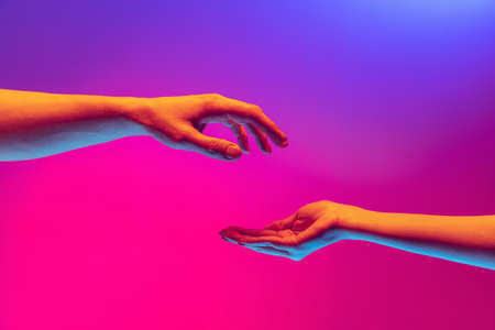Two authentic hands trying to touch each other isolated on gradient background in neon light. Concept of relationship, community, care, support, symbolism, culture