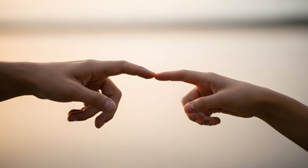 Two hands reach out with index fingers touching against a soft, blurred sunset background. The composition symbolizes connection, contact, human bond, or the spark of creation.