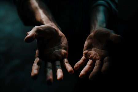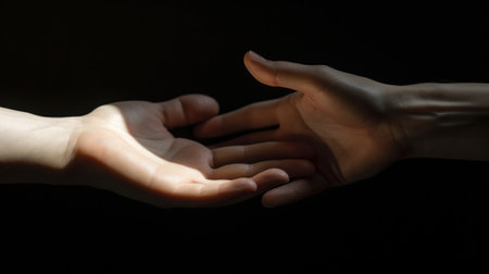 Dramatic, close-up of two outstretched hands reaching from the darkness. The hands are illuminated, conveying offering, supplication, or vulnerability against a dark, undefined background. Intense emotion.