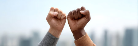 Two people showing their fists in a political protest for civil rights and equality, demonstrating their opposition to immigration raids and government policies