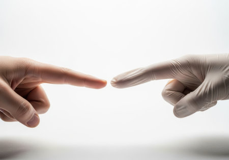 A close-up shot shows two index fingers, one bare and one gloved, reaching out to touch against a bright white backdrop.