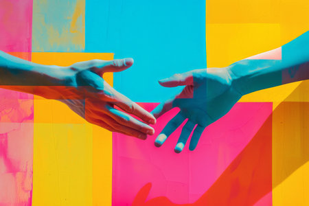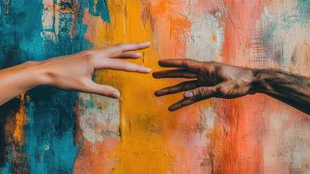 Close-up of two hands reaching towards each other on a vibrant abstract background, representing human connection amid diversity. --chaos