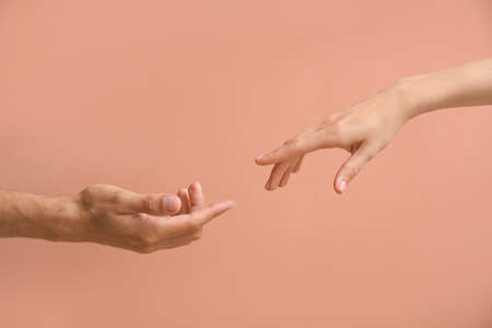Woman and man reaching out to each other on beige background