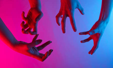 Two human hands trying to touch each other isolated on gradient blue-pink background in neon light. Concept of human relation, togetherness, symbolism, culture and history