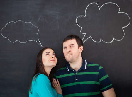 Young happy couple thinking. Chalk drawing on dark background