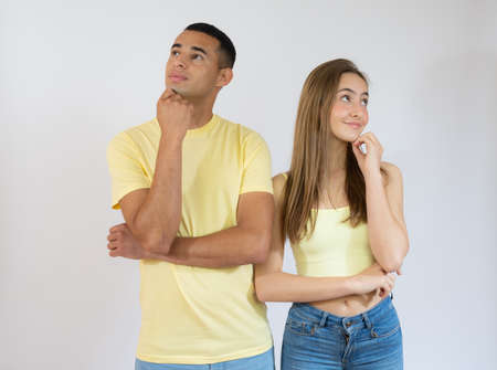Beautiful young couple of boyfriend and girlfriend together confuse and wonder about question. Pensive concept.