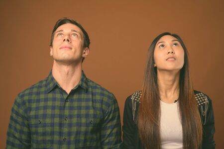 Studio shot of young multi-ethnic couple together against brown background