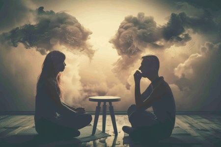 Two men stand back-to-back, facing opposite directions, with portions of their heads dissolving into particles. The image showcases a neutral color palette with soft lighting. This artistic composition could be used for various projects, offering visual representation suitable for conceptual and illustrative purposes.