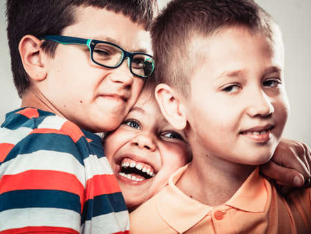 Portrait of happy smiling sweet cute kids little girl and boys in studio. Childhood happiness.