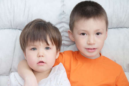 children sitting on coach, two toddler, children hugging each other, family portrait of boy and little girl, happiness in childhood of siblings
