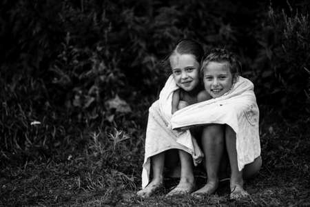 Two naughty little girls after bathe in the lake. Black and white photo.