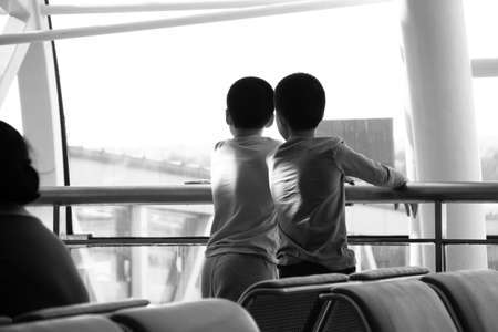 two brothers standing at window in living room.