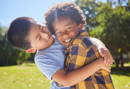 Asian boy hugging friend while looking at camera in park, banner