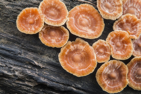 Clusters of soft orange mushrooms thrive on decaying wood showcasing their intricate patterns in a damp shaded environment.