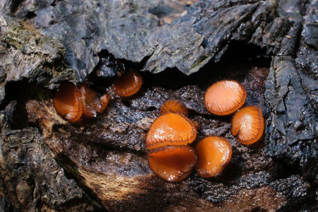 Group of orange jelly fungus, fan shaped jelly fungus, Dacryopinax spathularia on wet and old brown rotten log, selective fucus, top view, Thailand.