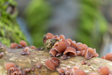 Close view of wood ear mushrooms Auricularia sp. clustered along a fallen tree. The gelatinous brown caps stand out against the blurred green forest background.