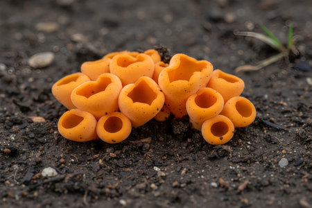 Tiny, bright orange, cup-shaped fungi emerge from the damp earth, showcasing their delicate structure and vivid color