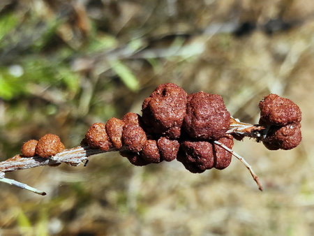Galls of an Uromycladium fungi on a branch of an acacia tree.