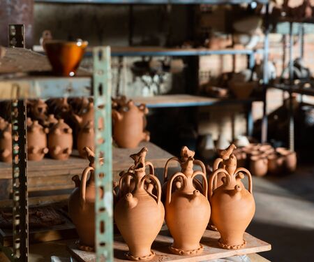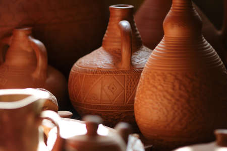 Different traditional Ukrainian pottery pots with ornament in souvenir shop, products of forming vessels and other objects with clay and other ceramic materials