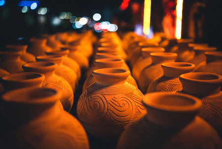 Vibrant collection of hand-painted ceramic pots with intricate patterns. That the image is generated using AI.