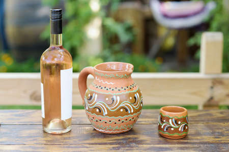 Rose wine bottle and traditional jag with ornaments on a restaurant table in Moldova